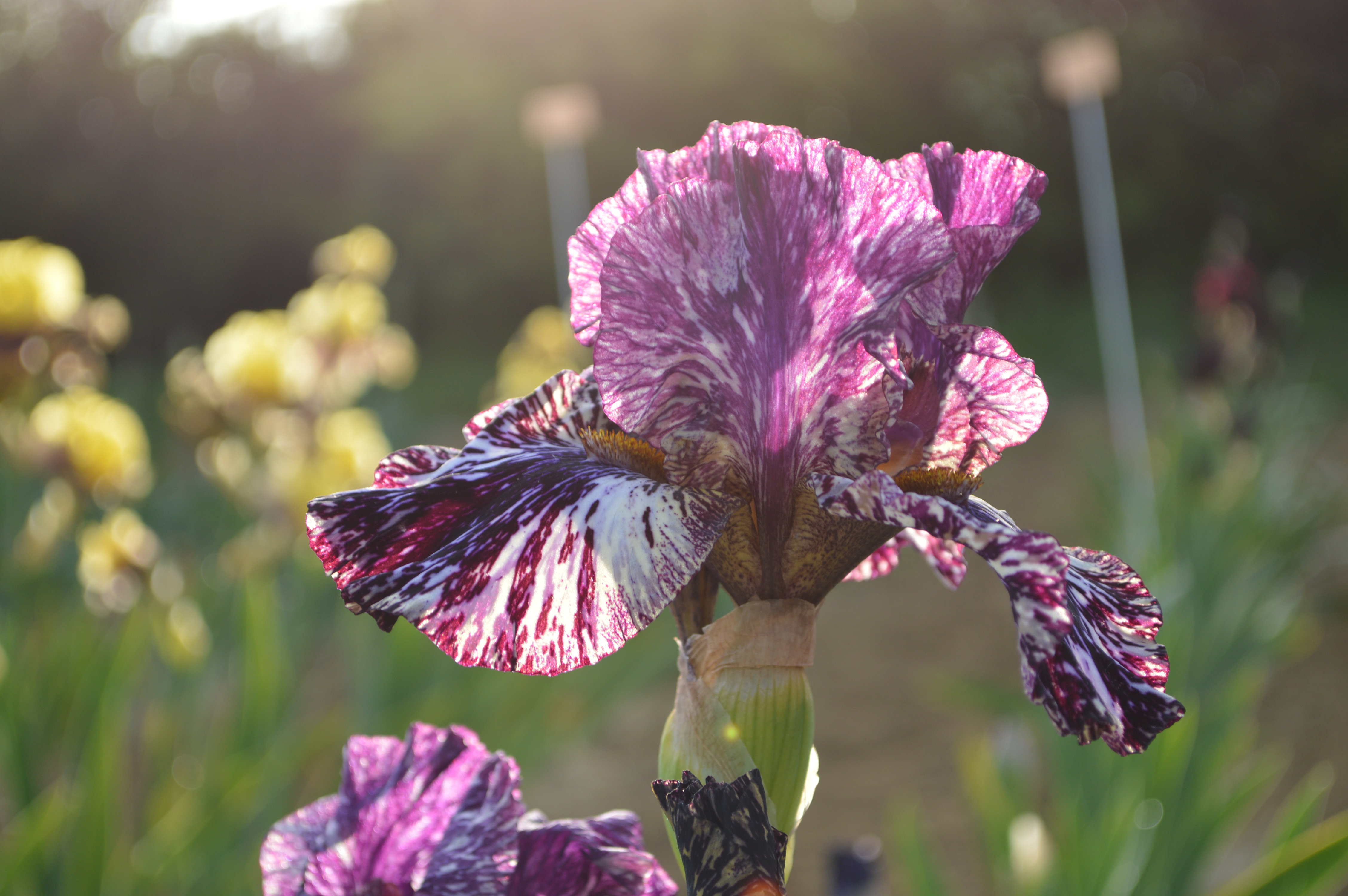 iris étonnant que cet iris Broken ; pétales beige marqué de violet, sépales violet contrasté de stries blanches.